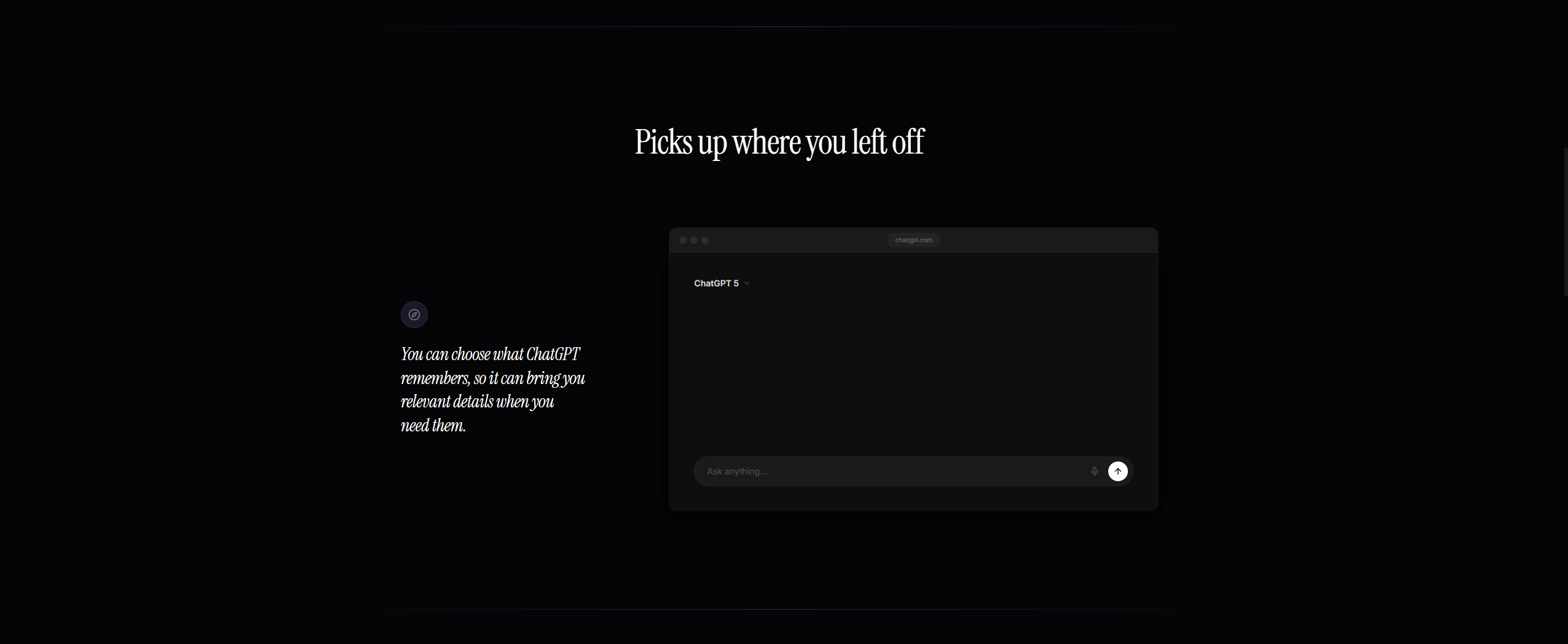 The memory system works like a great assistant. It remembers what matters so you never have to repeat yourself. Context lives on the left, conversation on the right. Coming back to a chat feels like opening a saved bookmark.